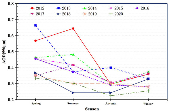 The AOD data of Hangzhou from 2012 to 2020 are divided into seasons according to the division of spring from March to May, summer from June to August, autumn from September to November, and winter from December to February. Then, the seasonal average AOD variation in Hangzhou from 2012 to 2020 is obtained and shown in Figure 11. In terms of the seasonal distribution, the AOD value in Hangzhou is relatively low in autumn and winter and high in spring and summer, with the lowest in autumn and the highest in spring. The causes of this result are analyzed as follows. In spring, Hangzhou is easily affected by the dust storms in the north or local pollution sources [32]. Combined with the fact that the temperature begins to warm up in spring, the atmosphere is relatively stable, which is favorable for the long-term retention of atmospheric aerosol particles, so the AOD value in spring is higher. Hangzhou has a high temperature and is rainy in summer, and the high temperature and high humidity conditions will promote the formation of aerosols, leading to urban aerosol accumulation [33], so the AOD value in summer is higher. In addition, the unstable subtropical monsoon climate results in a large dispersion of AOD values in spring and summer. The temperature drops in autumn, the wind is strong, the atmospheric condition is unstable, and it is difficult for the aerosol particles to remain for a long time. In this case, the AOD value is low in autumn. The northwest wind prevails in winter, the wind is strong, the atmospheric condition is unstable, but the air is dry. Because of this, the surface is bare, and there is much dust in winter, so the AOD value in winter is higher than that in autumn.