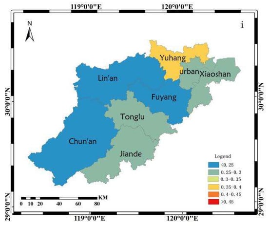 The AOD distribution of Hangzhou counties and districts from 2012 to 2020: (a) 2012, (b) 2013, (c) 2014, (d) 2015, (e) 2016, (f) 2017, (g) 2018, (h) 2019, and (i) 2020.