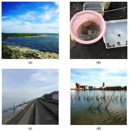 Pictures of Tokyo Bay (photographed by the authors): (a) view of Tokyo Bay from Chiba side toward Kanagawa’s industrial area; (b) many marine species can be found (picture taken at Urayasu, Chiba); (c) there are many spots to enjoy recreational fishing; and (d) empirical study site trying to revive interrupted seaweed cultivation on artificial seashores in Ota-ku, Tokyo.