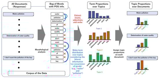 Figure 3 depicts the following two sections which explain the process of BTM, including preparation phase. To obtain the data required for the BTM, we conducted morphological analysis and annotation [47] with POS (part of speech) information on the text data and created a corpus (database) for all terms included in the obtained text data. Since a single response may contain multiple topics in the obtained free-associative descriptions, a list of biterms (pairs of two words that co-occur in documents) within a three-word distance (the minimum unit to describe co-occurrence relationships between words) was created. After that, we produced a matrix linking the included terms and biterm information for all response data, which was used as data for the BTM creation. In this study, we placed our focus on nouns, adjectives, and verbs, which are considered content words in the field of linguistics [50].