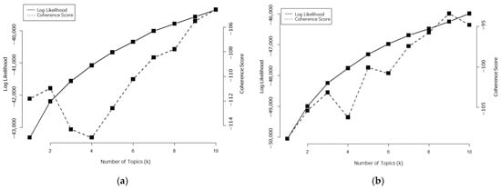 - Newman, D.; Lau, J.H.; Grieser, K.; Baldwin, T. Automatic evaluation of topic coherence. In Human Language Technologies, Proceedings of the 2010 Annual Conference of the North American Chapter of the Association for Computational Linguistics (HLT ’10), Los Angeles, CA, USA, 2–4 June 2010; Association for Computational Linguistics: Stroudsburg, PA, USA, 2010; pp. 100–108. [Google Scholar]