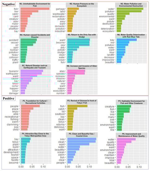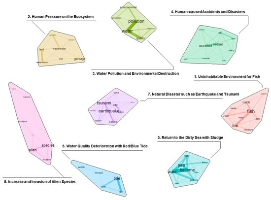 For the NFV, eight topics were extracted as shown in Figure 6 and Figure 7: (1) Uninhabitable Environment for Fish, (2) Human Pressure on the Ecosystem, (3) Water Pollution and Environmental Destruction, (4) Human-caused Accidents and Disasters, (5) Return to the Dirty Sea with Sludge, (6) Water Quality Deterioration with Red/Blue Tide, (7) Natural Disaster such as Earthquake and Tsunami, and (8) Increase and Invasion of Alien Species (in the following part, abbreviations from N1 to N8 are used). N1 reflects the voices about uninhabitable environment for fish (e.g., “I don’t want the water quality to be so bad that fish can’t live in it.”). It focuses on the marine environment and expresses concern about its degradation and unsuitability for marine life, including not only “fish” but also other “shellfish” and “creatures”. N2 encompasses the human pressures on the ecosystem, mainly related to “garbage”, “wastewater”, and “reclamation”. N3, as suggested by its name, pertains to water pollution and degradation of water quality. N4 is concerned with the characteristics of Tokyo Bay, a key marine transportation area, and the negative environmental impact of “vessel” “accidents”, as indicated by the word “oil”. N5 expresses a desire not to repeat Tokyo Bay’s history of pollution, using the words “dirty” and “sludge” in conjunction with the words “want” and “become”. N6 is about “red” and “blue” “tides”; the former refers to a phenomenon wherein phytoplankton experience abnormal growth due to nitrogen and phosphorus from wastewater, turning the seawater red. The latter refers to a phenomenon that occurs when plankton blooms decay and their carcasses sink to the seafloor, decompose, and generate anoxic water mass containing much hydrogen sulfide, which eventually rises to the sea surface due to strong winds such as typhoons, resulting in a blue sea appearance. Both can lead to oxygen depletion leading to fish mortality and landscape deterioration. N7 expresses concerns about the occurrence of earthquakes and tsunamis. N8 refers to the impact of invasive alien species on the ecosystem, which have become a growing issue in recent years.
