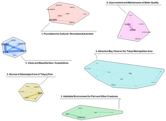 For the PFV, six topics were identified as shown in Figure 6 and Figure 8: (1) Foundation for Cultural/Recreational Activities, (2) Revival of Edomae (in front of Tokyo) Fish, (3) Habitable Environment for Fish and other Creatures, (4) Attractive Bay Close to the Tokyo Metropolitan Area, (5) Clean and Beautiful Sea/Coastal Zone, and (6) Improvement and Maintenance of Water Quality (in the following part, abbreviations from P1 to P6 are used). P1 pertains to the social and cultural significance of “recreational”, “clamming”, and “fishing” activities. P2 comprises words such as “fish” and “catch” stemmed with the word “edomae” (in front of Tokyo), reflecting the desire and demand for the revival of the once-thriving fishing industry. P3 is the counterpart of N1 and pertains to maintaining and improving the habitat for “fish” and other “creatures”. P4 is concerned with the “facility”, “tourist”, and “attraction” of Tokyo Bay and their “development”, representing one aspect of the expected functions of the bay, which exists on the side of a metropolitan area. P5 expresses a desire for a “sea” with adjectives such as “clear”, “clean”, and “beautiful”, while P6 is focused on improving water quality to achieve this goal.