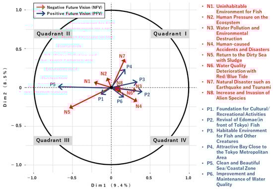 In the first quadrant of Figure 9, N7 displayed a high level of concern about earthquakes and tsunamis, and the original text data called for countermeasures to deal with these issues. The Great East Japan Earthquake in 2011 can be considered as a contributing factor to this situation. On the other hand, P4 in the same quadrant highlights the need for functions for bays near highly populated cities. In Japan, where earthquakes are a frequent occurrence, the coastal areas that drive attraction, development, and prosperity also face the constant risk of damage from earthquakes. This quadrant illustrates the delicate balance between value and risk that exists in densely populated regions, reflecting the reality of the situation in Japan. The direction indicated by the second quadrant, which includes N1 and N2, was expressed in the concern and fear of destroying the habitat of marine life represented by fish due to pollution from domestic wastewater and excessive landfill. P5, located at the boundary between the second and third quadrants, extends significantly in the direction between N1 and N5, suggesting that many survey collaborators mentioned topics belonging to this direction. In the case of N5, the vector of P1 indicated the same direction, demonstrating that not only commercial fisheries but also recreational activities such as clamming, which promote familiarity with the bay, were remembered especially by comparatively older respondents as one of the cultural values associated with these activities that have been lost through the history of pollution. For this very reason, sludge and pollution is seen as a detrimental influence on these activities, both presently and in the future. Furthermore, the fourth quadrant encompasses N4, N6, and P6, indicating the impact of widespread information dissemination, including through media reports, to residents about oil spills resulting from ship accidents and red/blue tides. Given Japan’s heavy dependence on marine products and maritime transportation, it is understandable that concerns about vessel accidents and environmental issues extend to a wide range of individuals. This includes not only those directly involved in fishery production or the maritime industry but also residents in the coastal areas of the bay. It is noteworthy that the vectors of P2, P3, and N3 all extend in the direction of the horizontal axis on the borderline of the first and forth quadrants. This group of vectors was mainly defined by a topic that expressed a desire to avoid repeating Tokyo Bay’s history of pollution and a wish to revive the Edo fishing industry that was lost due to the pollution.