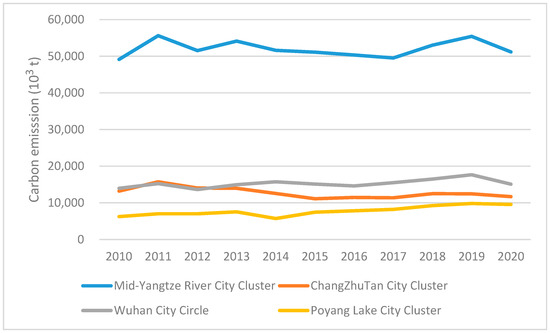 - In terms of total carbon emissions, the total carbon emissions of the middle reaches of the Yangtze River urban agglomeration show fluctuations between 2010 and 2020, the carbon emission reduction effect is unstable, and there is still room for more carbon emission reduction.