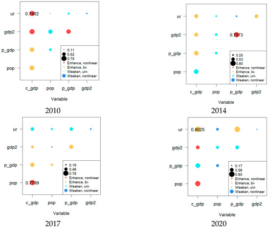 The results show that the explanatory power of the two-by-two interactions of the impact factors has eithers enhanced or weakened compared to the individual impact factors. The specific linear or non-linear enhancement can be found in Figure 4. The impact factors after the two-by-two interaction, with q-values > 0.7 for 10 pairs, were namely energy intensity (c_gdp) and urbanisation rate (ur), energy intensity (c_gdp2) and share of output in the secondary sector (gdp2) in 2010, energy intensity (c_gdp) and population size (pop) in 2014, energy intensity (c_gdp) and GDP per capita (p_gdp), energy intensity (c_gdp) and urbanisation rate (ur), energy intensity (c_gdp) and population size (pop) in 2017, energy intensity (c_gdp) and urbanisation rate (ur) in 2020, energy intensity (c_gdp) and population size (pop) and energy intensity (c_gdp) and urbanisation rate (ur), energy intensity (c_gdp) and population size (pop) and energy intensity (c_ gdp) and urbanisation rate (ur). It can be seen that the urbanisation rate had a limited impact on carbon emissions in 2010 and 2014, but interacted with the energy intensity factor to leapfrog the explanatory power of carbon emissions, and the same for industrial structure (Table 4).