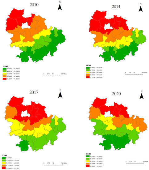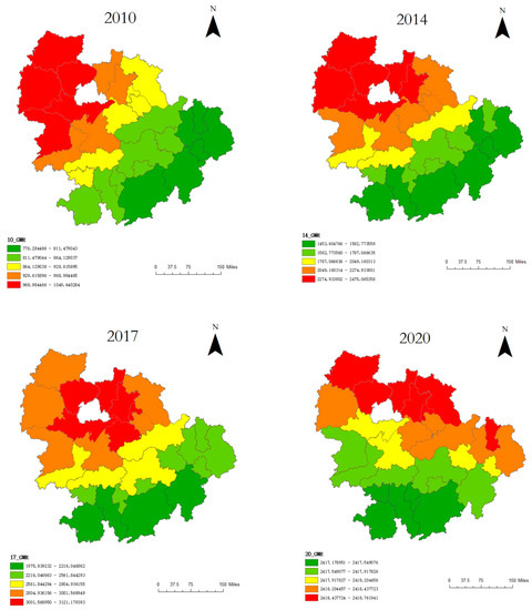 Spatial distribution of total carbon emissions in 27 cities in the middle reaches of the Yangtze River in 2010, 2014, 2017 and 2020.