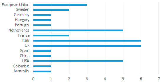 From Figure 1, it can be seen that Italy and the UK, followed by the Netherlands and the USA, are among the nations that in recent years have been most committed to implementing a circular system and identifying tools for this purpose.