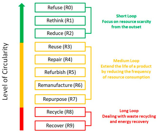 The Zero Waste Index, proposed by the International Zero Waste Alliance in 2004, on the other hand, is an innovative tool as it predicts the number of virgin materials, energy, water, and greenhouse gas emissions that can be saved by using resources recovered from waste streams. This gives a broader picture of the effective performance in different cities of waste management and the possible substitute resources that can be obtained. This indicator was limited to urban waste management systems for six broad categories of waste: paper, plastic, metal, glass, and organic and mixed municipal solid waste [48]. Therefore, it is essential to expand the use of this zero-waste index system and to ensure that it can also analyze other waste categories. Among these waste management systems, increasing attention is being paid to the 9R framework, which represents a generic classification system based on maximizing resource and product use, with the aim of achieving a more sustainable production capacity. Taking into account the waste hierarchy system, the 9R framework (Figure 2) consists of three major circuits: “short loop”, “medium loop”, and “long loop” [52]. According to this hierarchy of waste, producing the decision to promote short and medium circuits is certainly advisable and preferable to the application of the traditional long circuit [52].