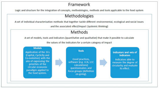 These documents were reviewed in such a way that the only ones taken into consideration were those that presented a detailed analysis clearly focused on (i) the CE paradigm applied to certain aspects of the food system and (ii) the use of methodologies based on indicators or metrics to evaluate the system’s circularity level. The documents published by the aforementioned sources, such as the additional material found through a snowball approach, were skimmed to find a clear reference to CE metrics and were otherwise excluded from the analysis. Through these selection criteria, reports, online CE evaluation tools, and white papers were included in the review [14].