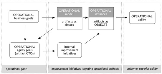 Agility should, as such, exist at any organizational level, from strategic/business/organizational level agility down to product or service, tools, and even (employee) personal agility. We focus in this article on the operational level of agility, i.e., the ability of a company to adapt its operations, technology, and information to perpetually changing business requirements [14,26], to allow managers to achieve the desired competitive advantages [24].