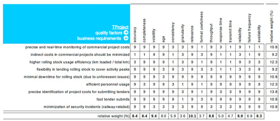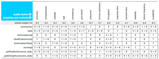 Quantitative metrics such as age, accuracy or transmit time, used in step 5 to measure the quality levels of artifact properties and methods, do guarantee different numeric values for different quality levels of information. This does not necessarily hold for qualitative metrics such as relevance or format usefulness; a workaround was, in our case, to gain consensus on the quality level by forming a mixed team to help us assess those particular quality aspects. The team consisted, in addition to the authors, of one key person from the technical department and two persons from the train staff.