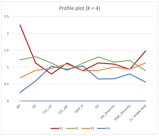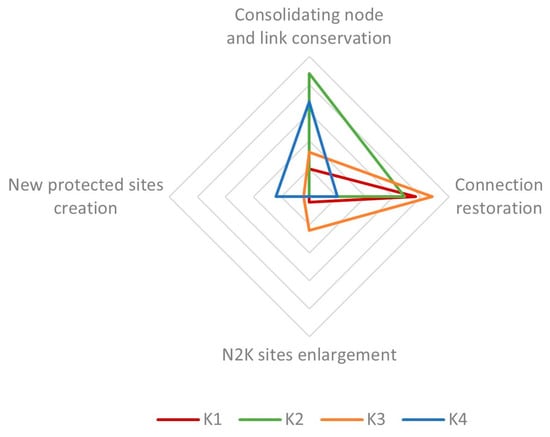 - K2—a medium-high number of N2K patches, with the highest density of patches and edges, interspersed in natural matrices with the highest SWF density and the highest litho-morphological and phytoclimatic diversity;