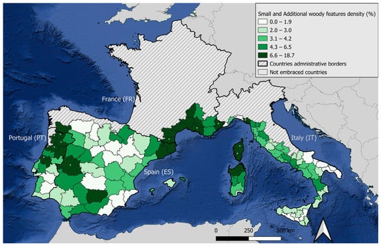 | Additional woody feature cover density (AWF_D) | Cover density of AWF, woody features connected to a valid SWF and isolated features larger than 1500 m2 (or wider than 30 m, if linear and out of specific patches) in the overall NUTS3 in % | “Small woody features” High-Resolution Layer [47] |