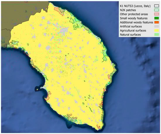 - K1—a high number of N2K patches, although not with the highest density, interspersed in agricultural matrices with a medium-low SWF density;