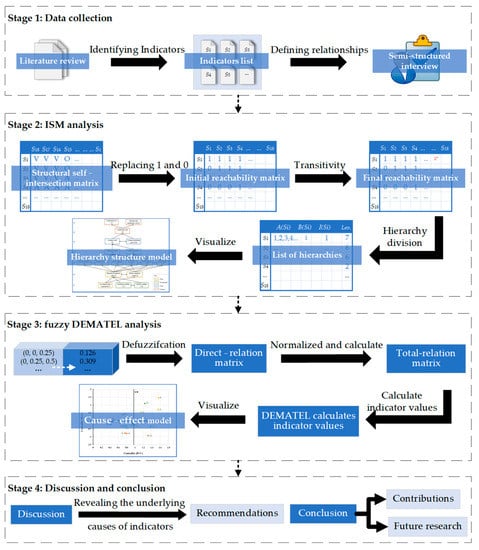 As shown in Figure 1, this study adopted a 4-stage mixed research approach. Firstly, a list of indicators influencing the location of HRSs was obtained through a literature review, and their interrelationships were preliminarily described using semi-structured interviews. Secondly, the ISM approach was used to analyze the hierarchical relationship between indicators and establish a hierarchical structure. Thirdly, the total-relation matrix was calculated based on the FDEMATEL method, and the cause–effect relationship digraph was constructed. Fourthly, discussions were carried out based on the above results, and targeted opinions and solutions, as well as future research directions, were proposed.
