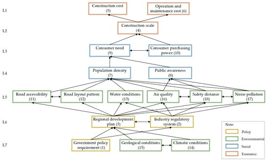 Cause–effect digraph. (–: government policy requirement; industry regulatory system; regional development plan; construction scale; construction cost; operation and maintenance cost; population density; public awareness; consumer need; consumer purchasing power; road accessibility; road layout pattern; water conditions; climatic conditions; geological conditions; air quality; noise pollution; and safety distance).