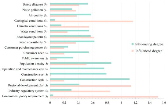 The influencing degree of the effect indicator is less than the influenced degree, indicating that this type of indicator will be generally influenced by other indicators [67], including (construction scale), (construction cost), (operation and maintenance cost), (population density), (public awareness), (consumer need), (consumer purchasing power), (road accessibility), (water conditions), (air quality), and (safety distance). The greater the centrality, the greater the disturbance to the system when this type of indicator is influenced by other indicators; it is a weak link in the system [63]. The most typical examples are and , distributed in level 2 and level 4. The environmental indicators of this hybrid fuzzy decision-making model are different from previous studies in that they include not only human environmental indicators, but also natural environmental indicators [52]. Through the results and discussion, it can be known that the natural environment indicators will largely affect the human environmental indicators, which also reminds decision makers of how to prioritize when faced with complex environmental indicators.