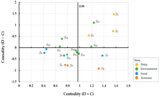 The degree of influence is the sum of rows in the total-relation matrix , which represents the comprehensive influence value of an indicator on other indicators, including direct and indirect influence. The degree of influence is the sum of columns in , and it is the value of an indicator affected by other indicators comprehensively. The centrality indicates the importance of a certain indicator in the system, which is the total degree to which the indicator affects and is affected by other indicators. The larger the centrality, the more important the indicator in the system is. The degree of causality represents the net impact of an indicator on other indicators, that is, the offset value of the impact produced and the impact received, which is obtained by subtracting the two. The above calculation equation is shown in Equations (19)–(22), and the calculation results are shown in Table 11.