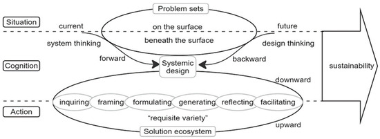 To make progress amid complexity, systemic practitioners require an effective way of thinking or cognition. Managerial cognition is an information-filtering process through which rational managers translate their knowledge structures to select strategies and make decisions based on their understanding of changes in organisational circumstances [50]. It can effectively guide follow-up action strategies [55]. In systemic design, managerial cognition offers an interdisciplinary approach emphasising selective attention and effect cause analysis, which differs slightly from the approaches used in organisational management. In particular, a systemic design provides designers or practitioners with efficient managerial cognition to confront complexity and take action because it is an organic convergence between systems thinking and design thinking [56]. A systemic designer first takes a step backwards from ‘design’ to systems thinking, which involves perceiving, modelling, and intervening in the world as if it were composed of open, purposeful, complex wholes [19]. Subsequently, by moving a step forward from ‘system-thinking’ to design thinking in a normative, user-centred, and iterative manner, the application of the design can then be extended beyond symbols, objects, and interactions [57]. A practitioner or designer adopting a systemic approach, similar to a manager, must build, integrate, reconfigure, and manage a wide range of resources [58]. Further, they must do so while using the cognitive capabilities of pattern recognition, situation interpretation, and visual presentation [42].