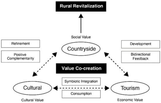 The integration of rural cultural tourism forms a value co-creation system by blending and interconnecting the three elements of the countryside, culture, and tourism [8]. Tourism in rural areas is primarily driven by local culture, which attracts tourists to visit and experience. In addition, the arrival of tourists promotes the reproduction of rural cultural resources, converts them into tourism resources, and generates economic value by drawing consumer traffic. Furthermore, tourism development contributes to the improvement of rural infrastructure, the enhancement of the living environment, and the creation of positive interaction between the countryside and tourism, contributing to rural revitalization (see Figure 1).