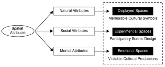 Dicks (2004) [9] believes that culture needs to be integrated deeply to make it visible and visitable in space. The countryside and its culture are made accessible for visitors, participants, and reminiscence by creating a rich cultural experience, attracting tourists’ attention, and forming a consumerist space. This sort of experience stimulates tourists’ desire for the countryside, allowing them to develop unique cultural identity cognitions as a result and form deep experiential memories. Henri Lefebvre [10] asserts that space has three attributes: natural, spiritual, and social, forming material space, mental space, and social space. Based on Lefebvre’s (1976) [11] spatial division and the special form of rural cultural tourism integration, this article constructed a spatial analysis framework that integrated display–experience–emotion (See Figure 2). Among them, the display space emphasized natural attributes and visibility; the experience space emphasized social attributes and interaction; and the emotional space emphasized spiritual attributes and reminiscence. As a result of these three intertwined spaces, rural tourism’s cultural connotations were shaped, and a lasting impetus was imparted to its inheritance and development.