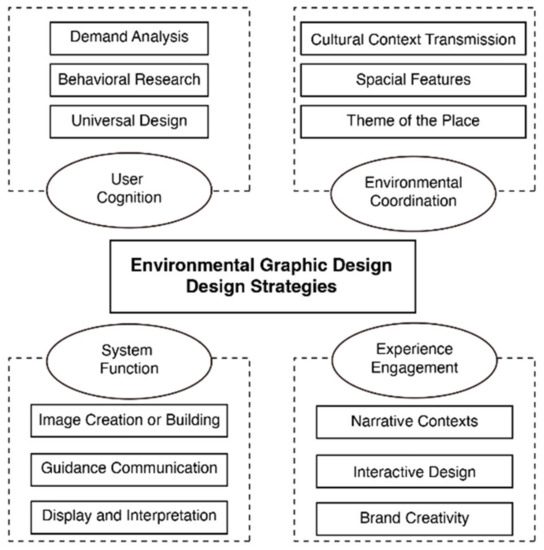 Norwegian architectural theorist Christian Norberg-Schulz (2013) [15] proposed that a place is the location where human behavior and events occur; a place is a product of the meanings and values people assign to it. Schulz also emphasized the multiplicity and dynamics of places. Places are not static; they constantly evolve with human activities. The interrelationship between people and information in the space of places is specifically described in environmental psychology: (1) the situation of a human’s need to receive environmental information in the environmental space; and (2) what psychological effect the means of information transmission in space have on people, or what type of transmission method would be most effective. Hence, the design of places should take into account future developments, changes, and the cultural and social factors brought about by human activities to accommodate the changing needs of human activities over time. There are four main factors to be considered when designing an environmental graphic interface: user characteristics, environment coordination, system efficacy, and experiential engagement [16,17,18]. As illustrated in Figure 3, Zhang Hongze’s 2019 book Environmental Graphics Design [19] further divided the environmental graphics design strategy according to the above factors (see Figure 5), which indicates that the graphics incorporate multiple disciplines of thought.