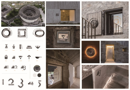 In the cultural creativity stage, the unique shape of Yongding Tulou itself had a strong recognition, so it was good material for conceptualization while taking into account the hidden appearance of the Tulou in the local climate of Fujian, where it is always rainy and misty. In the creation stage, prevalent Tulou forms were transformed into geometric shapes, while the black and white color scheme drew inspiration from the building’s inherent architectural palette. The incorporation of modern ink gradients effectively captured the picturesque beauty of the Tulou shrouded in clouds and fog. In the environmental application phase, the design approach acknowledged Tulou’s extensive history and the unsuitability of drastic spatial alterations. Consequently, graphic symbols were ingeniously applied to doors, windows, and walls, fulfilling both decorative and indicative functions. In terms of creative content, the design preserved traditional elements and rhythm while simultaneously contemplating harmony with the modern architectural styles present within Tulou.