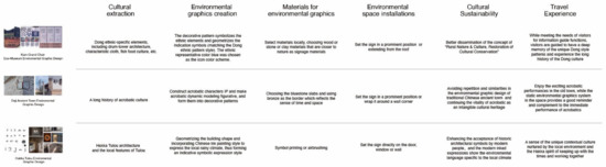 To sum up, we summarized the following points when designing environmental graphics for rural cultural tourism brands in the context of cultural sustainability to illustrate how to make the presentation of graphics convey the local culture while maintaining its design characteristics: