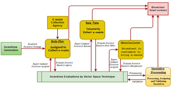 The effectiveness of incentive strategies cannot be determined by a universal formula [32]. However, a thorough analysis of the specific individual, task, and organizational variables involved can facilitate the identification of successful incentive approaches. That is why the processing of incentives in each scenario will vary due to the distinct objectives of the respective tasks. The implementation of a blockchain-based recording and monitoring system involves the assignment of specific roles and corresponding incentives for each task, which are associated with the concepts of role-playing and role-taking. Individuals who assume specific roles and engage in role-playing activities have the potential to effectively gather e-waste materials, and subsequently dispose of them in designated locations. The role of agencies involved in e-waste collection is defined and described as role-playing. Additionally, manufacturers have the ability to establish an EPR policy framework, which designates the responsibility of managing e-waste to the manufacturers of electronic devices.