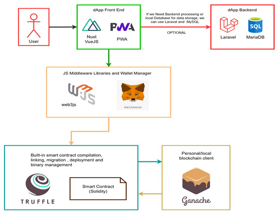 - Verma, R.; Dhanda, N.; Nagar, V. Application of Truffle Suite in a Blockchain Environment. In Proceedings of the Third International Conference on Computing, Communications, and Cyber-Security: IC4S 2021; Springer Nature Singapore: Singapore, 2022; pp. 693–702. [Google Scholar]