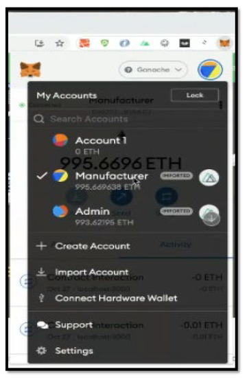 The smart contract can only be accessed through the unique admin account, which also serves as the contract’s creator. The administrator has access to all product records and can follow the product’s ownership chain from its creator to the present day. The administrator can also discover the whereabouts of any out-of-date products that have not been brought to the e-waste center, and provide that information to the current owner.