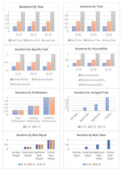 This follows the proposed vector space technique; the mappings offer a methodical strategy for providing incentives for tasks and considering various factors that could impact task execution and drive. Note: in Figure 7 and Table 2 and Table 3, the following applies: A = size of performing task; B = time for performing task; C = specific activities of a task; D = accessibility of the task; E = performance of a task; F = role played for incentives; G = role taking for incentives; H = assigning a task for incentives.
