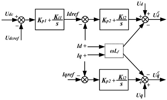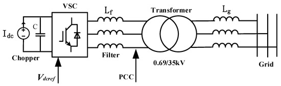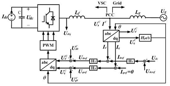 Figure 3 presents the structure of the test system for the grid-connected VSC, which consists of the main circuit and control schemes. The VSC control consists of the d-axis control and the q-axis control: the d-axis control ensures the DC voltage of the capacitor remains at a constant value, and the q-axis control regulates the q-axis current feeding into the power grid at the expected value. As seen in Figure 3, Udc represents the DC voltage on the VSC side, and Idc represents the DC current on the DC side. and represent the voltage at the terminal of the VSC. and are the initial values at the PCC under steady-state conditions. Lf represents the filtering inductance, and Lg represents the equivalent impedance of the external grid. and represent the voltage at the PCC and the voltage on the grid side, respectively. θ is the phase angle of the voltage at the PCC provided by the PLL.