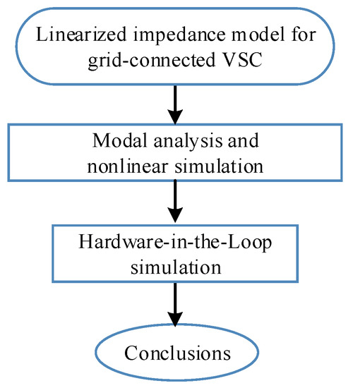 References [20,21] propose robust control to improve the performance of LCL-filter-based grid-connected VSC. The LCL filter is widely used for filtering switching harmonics, but LCL-filters might cause the resonance phenomenon. References [22,23] present that increasing the grid-side inductance will lead to a decrease in the system short-circuit ratio (SCR) and take a negative effect for the system stability. References [24,25] discuss the impact of PI control parameters in the PLL on the oscillatory stability. However, there are few papers that clearly and systematically analyze how the control parameters influence the frequency and damping of the oscillatory modes. References [26,27] comprehensively analyse the impact of line inductance for system stability based on the Nyquist criterion. This paper presents a new methodology for simplifying the impedance model by shifting the observation of the output of the VSC control system so that the coupling terms do not exist in the mathematical derivations for impedance modeling. Using the new simplified model, the stability and the spectrum characteristics of the performance of the VSC can be clearly analyzed. This paper is structured as follows: Section 2 and Section 3 present the derivation of the proposed second-order dq impedance model and the stability criterion of a VSC; Section 4 presents the impact of the control parameters on the wideband oscillatory stability of a VSC using modal analysis and nonlinear simulation; and Section 5 demonstrates the impact of key parameters of the VSC controller on oscillations using hardware-in-the-loop (HIL) simulation. In the end, Section 6 concludes the paper. Figure 2 gives the flow chart of the research methodology.