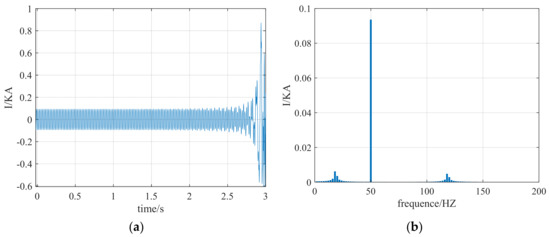 As seen in Equation (49), when a small perturbation with frequency fp ( = 2πfp) exists, a corresponding component with frequency of emerges during the coordinate transformation. Similarly, if the frequency of perturbation is , the output of the system contains two components with frequencies and . Therefore, the oscillatory components not only emerge in pairs, but are also symmetrical, with the fundamental frequency as the center. The magnitude of each component depends on the magnitude of the positive-sequence admittance and negative-sequence admittance. When the frequency of perturbation is negative, the output amplitude of the negative-sequence oscillatory component coincides with some positive-sequence oscillatory components (oscillatory frequency is more than 0). Therefore, it is difficult to identify the pairs of oscillatory components in the frequency spectrum of wideband oscillatory signals.