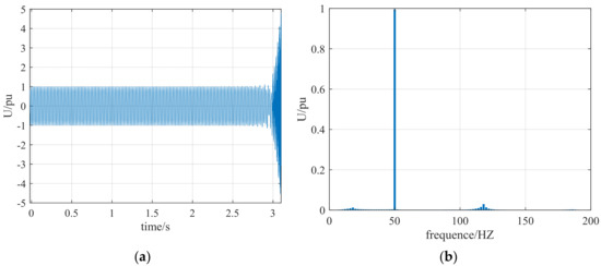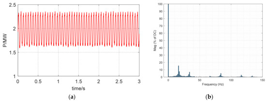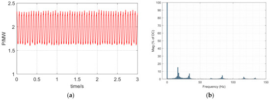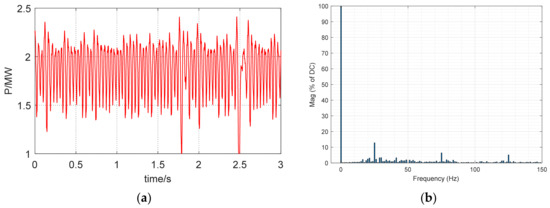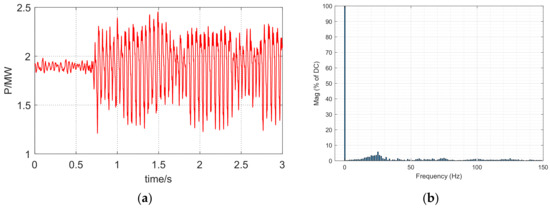 The presence of a pair of positive real part eigenvalues indicates the existence of unstable oscillatory modes in the system. The nonlinear time-domain was used to demonstrate the results of the eigenvalue analysis. Figure 7 presents the active power at the PCC, and Figure 8 presents the results of FFT analysis of the oscillatory signal. As confirmed by the FFT results, there is an oscillatory mode of 68 Hz in the system, which is consistent with the eigenvalue analysis. Figure 9 and Figure 10 present the instantaneous signals of voltage and current and the results of the corresponding FFT analysis.