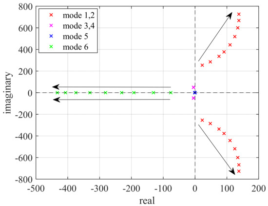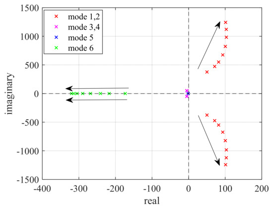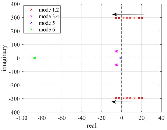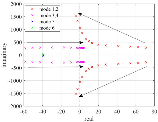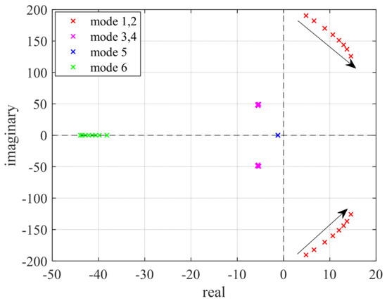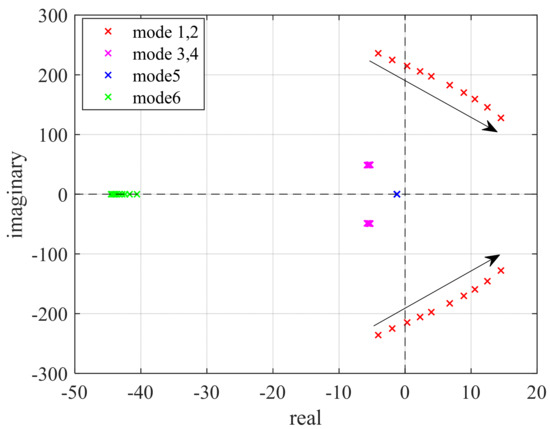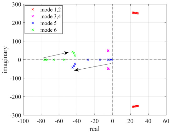 After setting Ki1 = Ki2 = 18 and Ki3 = 150 and keeping other parameters consistent with Table 1, then changing ωn from 18.4 to 42.4, Figure 17 presents the system’s oscillatory modes for different Kp and Ki values. As Kp and Ki increase, oscillatory modes 1 and 2 move to the left, then enter the left half-plane, whereas oscillatory modes 3 and 4 move gradually to the right and enter the right half-plane. The oscillatory modes 5 and 6 hardly change as Kp and Ki increase.