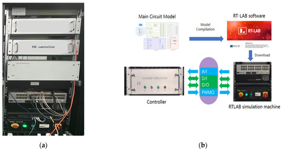 To further investigate the impact of control parameters of VSC on the oscillations, a HIL simulation platform is set up. The HIL simulation platform mainly consists of a PC, RT-LAB simulation machine (OP5700) and a hardware of the VSC controller. Here, the controller has a sampling and control period of 4 kHz, and the frequency of the Space Vector Pulse Width Modulation (SVPWM) is 4 kHz. The hardware and the schematic diagram simulation platform are given in Figure 20.
