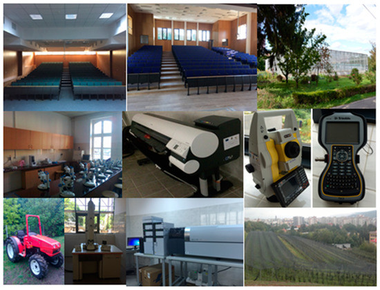 The research materials that are used and described in this section are also presented in the above images. Figure 1 presents an emblematic image of the university attesting its antiquity and profile, under the emblem “Tradition and Modernity”, the UASVM Central Library of the university which contains both the database (online and offline) that underlies the new horticultural research and the results of horticultural research (and not only) published by our researchers, an image of the Biodiversity Research Centre (Gene Bank) and, finally, an overview of the Advanced Horticultural Research Institute of Transylvania, the basic engine of this scientific article. Figure 2 illustrates a sample of the most important equipment: IRC, amphitheater, vegetable greenhouse, modern magnifying glasses and microscopes, GPS last generation devices, a plotter, an electron microscope and a chromatograph (state of the art), as well as an orchard tractor and installation hail.