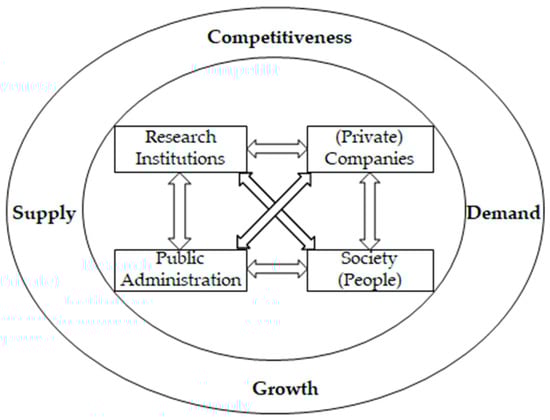 Knowledge and its transference are increasingly viewed as key factors of companies’ competitiveness [48]. Research can lead to science-based innovations, which trigger a considerable increase in productivity, new products and services, and improved competitiveness. The business sector can benefit massively from innovation, insofar as innovation strategies are effective, based on public–private interaction, to meet societal challenges. The experiences developed in the market and mentioned in the literature by several authors attest to the fact that only the supply of innovation is not sufficient, the demand for innovation being absolutely mandatory (commercial opportunities). Demand-driven policies are those that can induce investment in technologies by expanding markets for them [49].