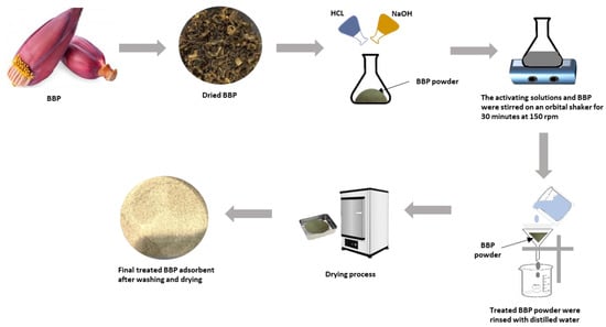 Banana blossom peels (BBP) were collected from banana planters at Pagoh Jaya, Muar, Johor, Malaysia. The BBP was properly scrubbed and washed to eliminate surface contaminants; the BBP was then chopped into tiny pieces and oven-dried for 12 h at 60 °C ± 1 °C. The BBP was grounded and sieved into powder with a standard mesh ring of 150–212 µm. The BBP powder was submerged in 20 mL of 1 M HCl and sodium hydroxide (NaOH). The alkaline–acid treatment has demonstrated potential as a cost-effective method for modifying adsorbents, leading to their enhance efficiency for water treatment []. The BBP powder was mixed for 30 min with chemical activation solutions in an orbital shaker at 150 rpm. Any remaining chemicals on the surface were removed by rinsing the BBP with distilled water. The BBP powder was then dried for 12 h at 60 °C ± 1 °C for 12 h [] and sieved using a standard 60 mesh sieve. Figure 1 shows a schematic illustration of BBP adsorbent preparation.