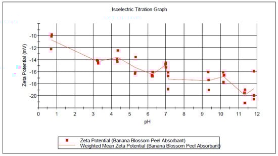 The electrokinetic potential in colloidal systems is known as zeta potential; it can also describe the surface of charged particles. The zeta potential can be influenced by both surface charge and ambient factors, and it may be affected by pH and ions in the medium as a result. In the present study, a zeta potential value of −9.87 to −21.1 mV (Figure 2) was obtained in the BBP adsorbent. These results are in slight accordance with Anai Zavala-Franco et al. [], who reported BBP zeta potential values of −12.7 to −14 mV, respectively. High zeta potential indicates strongly charged particles, which precludes particle aggregation owing to electrostatic repulsion. The attraction will overpower the repulsion if the zeta potential value is low and it is prone to form coagulates [].
