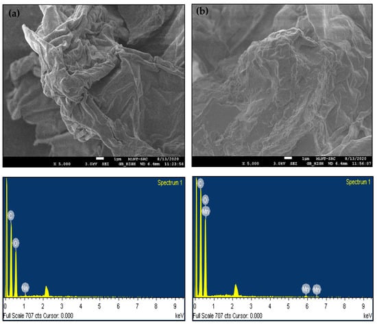 Figure 3 shows the surface morphology, microstructures, and physical characteristics of the BBP adsorbent before and after Mn adsorption, respectively, as measured by FESEM. The BBP adsorbent’s surface is crimped with deeper dents, has a rough interior surface, and is dense (Figure 2). Due to extremely uneven surfaces that give maximal surface area for manganese ion adsorption, the shape of BBP may enhance Mn adsorption [,,,]. EDX examination revealed the presence of significant carbon (C), oxygen (O), and sodium (Na) components in Figure 3a,b.