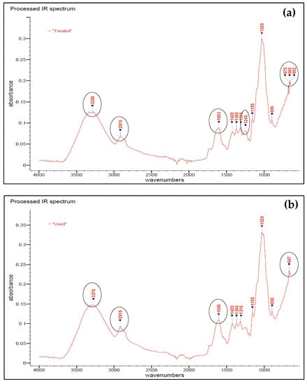 The asymmetric stretching of the carboxylic C=O double bond, which is prevalent in pectin-containing fibre materials, correlates to changes in the band from 1603 cm−1 (Figure 4a) to 1606 cm−1 (Figure 4b). The peaks at 1245 cm−1 are created by C-O stretching vibrations in hemicellulose and C-O stretching vibrations in the acetyl group in lignin, as shown in Figure 4a. The absence of the 1245 cm−1 peak noticed in Figure 5b after the adsorption process pointed to the loss of hemicellulose and lignin []. The change of bands observed from 675–652 cm−1 in Figure 4a to a single band of 667 cm−1, in Figure 4b, may represent the aromatic C-H groups []. The presence of functional groups (hydroxyl, carboxyl, amine, etc.) in the BBP adsorbent had contributed to the adsorption.