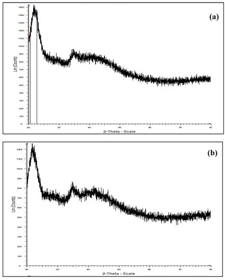 Figure 5a,b shows XRD analysis of the BBP adsorbent before and after manganese adsorption, respectively. The absence of sharp peaks and the appearance of a broad low-intensity diffraction background indicate that the structure of the BBP adsorbent is an amorphous phase connected to the carbon structure []. Other than that, it is also due to organic materials and volatile substances. The existence of typical crystalline cellulose peaks was discovered at a temperature of 2θ ≈ 22°. The crystal structure of cellulose [] is thought to be responsible for the peak. There were no significant variations in the crystalline peaks of the BBP adsorbent after adsorption, except that the intensity of the phases decreased, indicating that manganese ions were replacing the ions and changing the structure of the BBP adsorbent. This reveals that manganese adsorption did not alter the structural space of BBP adsorbents, and, hence, the adsorption process happened on the surface.