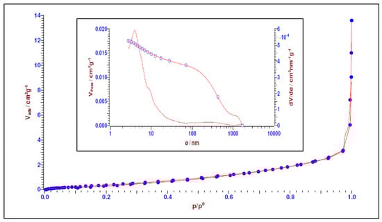 Adsorption is a complicated process influenced by several parameters, including the adsorbent’s pore structure, size, and surface chemistry. The interpretation of Figure 6; the red line (represents the adsorption isotherm) and blue dot (represents the isotherm corresponds to the point of maximum inflection known as the monolayer coverage point). The average pore diameter of the BBP adsorbent is 64.35 nm, with a BET surface area of 2.12 m2/g, and a total pore volume of 0.0139 cm3/g. Figure 6 shows the nitrogen adsorption–desorption isotherms and pore size distribution curves (inset) of the BBP adsorbent. According to the IUPAC classification, the isotherm for the BBP adsorbent is classed as type 3 macropores (>50 nm). Because it has an ionic radius of roughly 0.80 nm, the pore size distribution makes it excellent for adsorbing manganese ions []. Manganese ions were, therefore, able to enter the biggest micropores (less than 2 nm, according to IUPAC classification). Most agro- or carbonaceous materials have a low surface area [], but a material’s low surface area does not imply a low adsorption capacity []. The functional groups (amino, carbonyl, carboxyl) present in the structure of the adsorbent are primarily responsible for the adsorption capabilities of non-living biomasses [].