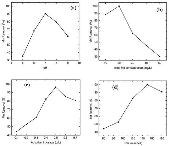 Effect of (a) pH, (b) initial Mn concentration (mg/L), (c) BBP adsorbent dosage (g/L), and (d) contact time (minutes) for Mn removal.