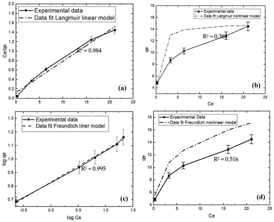 In the liquid state, adsorption isotherms are useful for demonstrating the behaviour, mechanism, and optimal fit of metal ion concentration on the surface of adsorbents at a certain concentration [,]. This study employed the Langmuir and Freundlich models in order to study the link between the Mn concentration adsorbed by BPP and the linear and non-linear equations. Solute monolayer adsorption onto an adsorbent surface was considered to represent the Langmuir isotherm, and the equation is as follows: