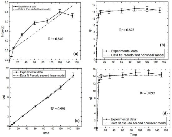 (a) Linear and (b) non-linear of pseudo-first-order; (c) linear and (d) non-linear of pseudo-second-order kinetic model for Mn adsorption using BBP.